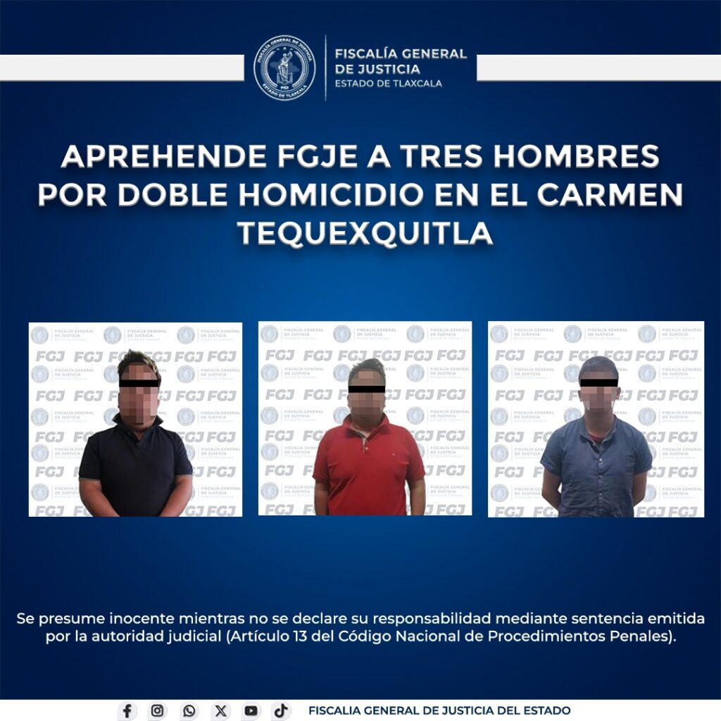 Gracias a los trabajos de inteligencia y campo realizados por la Policía de Investigación, la Fiscalía General de Justicia del Estado (FGJE) logró la aprehensión de Raúl N., alias “El Becerro”; Orlando N., alias “La Vaquita”; y Bryan N., por su probable responsabilidad en el delito de homicidio calificado, cometido en el municipio de El Carmen Tequexquitla en agravio de dos hombres.