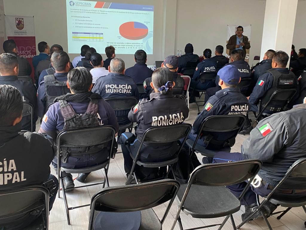 Con la finalidad de prevenir delitos en sucursales y cajeros automáticos de instituciones bancarias que operan en el municipio de Chiautempan, 130 elementos de la Dirección de Seguridad Pública participaron en el curso “Modalidades de robo a cuentahabiente y tarjetahabiente”.