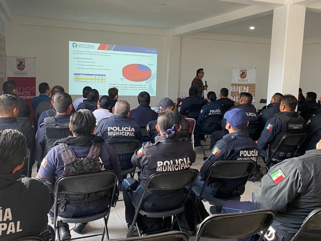 Con la finalidad de prevenir delitos en sucursales y cajeros automáticos de instituciones bancarias que operan en el municipio de Chiautempan, 130 elementos de la Dirección de Seguridad Pública participaron en el curso “Modalidades de robo a cuentahabiente y tarjetahabiente”.