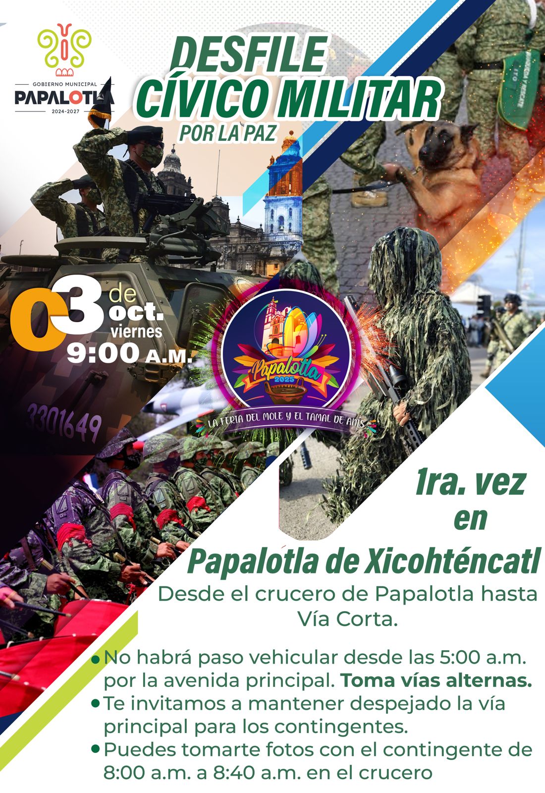 El próximo viernes 3 de octubre, el municipio de Papalotla de Xicohténcatl será sede por primera vez de un desfile cívico militar por la paz que recorrerá las principales calles de la localidad, en el marco de las celebraciones de la tradicional Feria del Mole y el Tamal de Anís, uno de los eventos gastronómicos y culturales más importantes de la región.