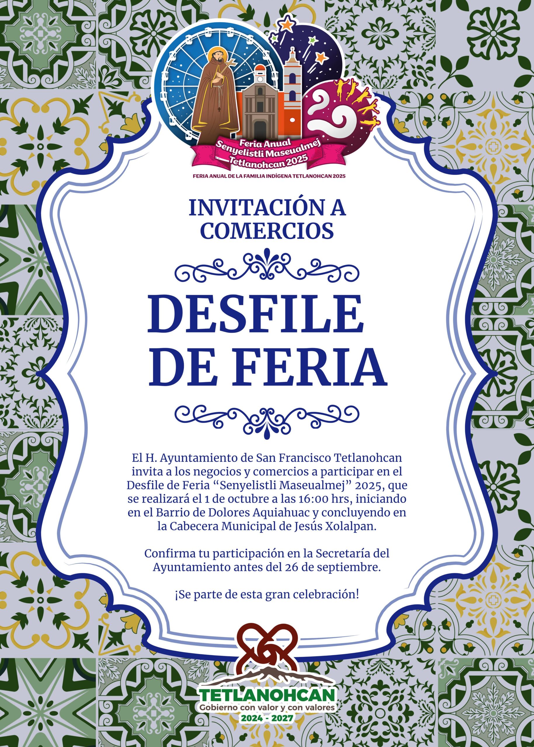San Francisco Tetlanohcan, Tlax., septiembre de 2025. – El H. Ayuntamiento de San Francisco Tetlanohcan, administración 2024–2027, invita a los comercios, negocios y establecimientos locales a sumarse al Desfile de Feria “Senyelistli Maseualmej” 2025, como parte de la Feria Anual de la Familia Indígena.