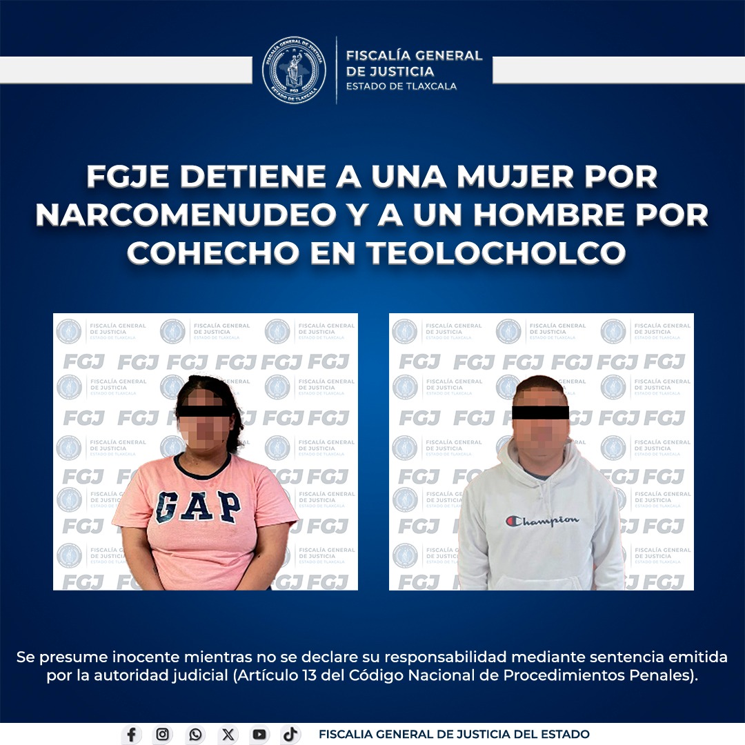 Tras el aseguramiento, las dos personas, quienes se identificaron como Christian N., de 24 años de edad, y Luz Elena N., de 23 años de edad, fueron puestas a disposición de la autoridad competente, junto con los objetos asegurados, a fin de que se realicen las investigaciones correspondientes y se determine su situación legal conforme a derecho.
