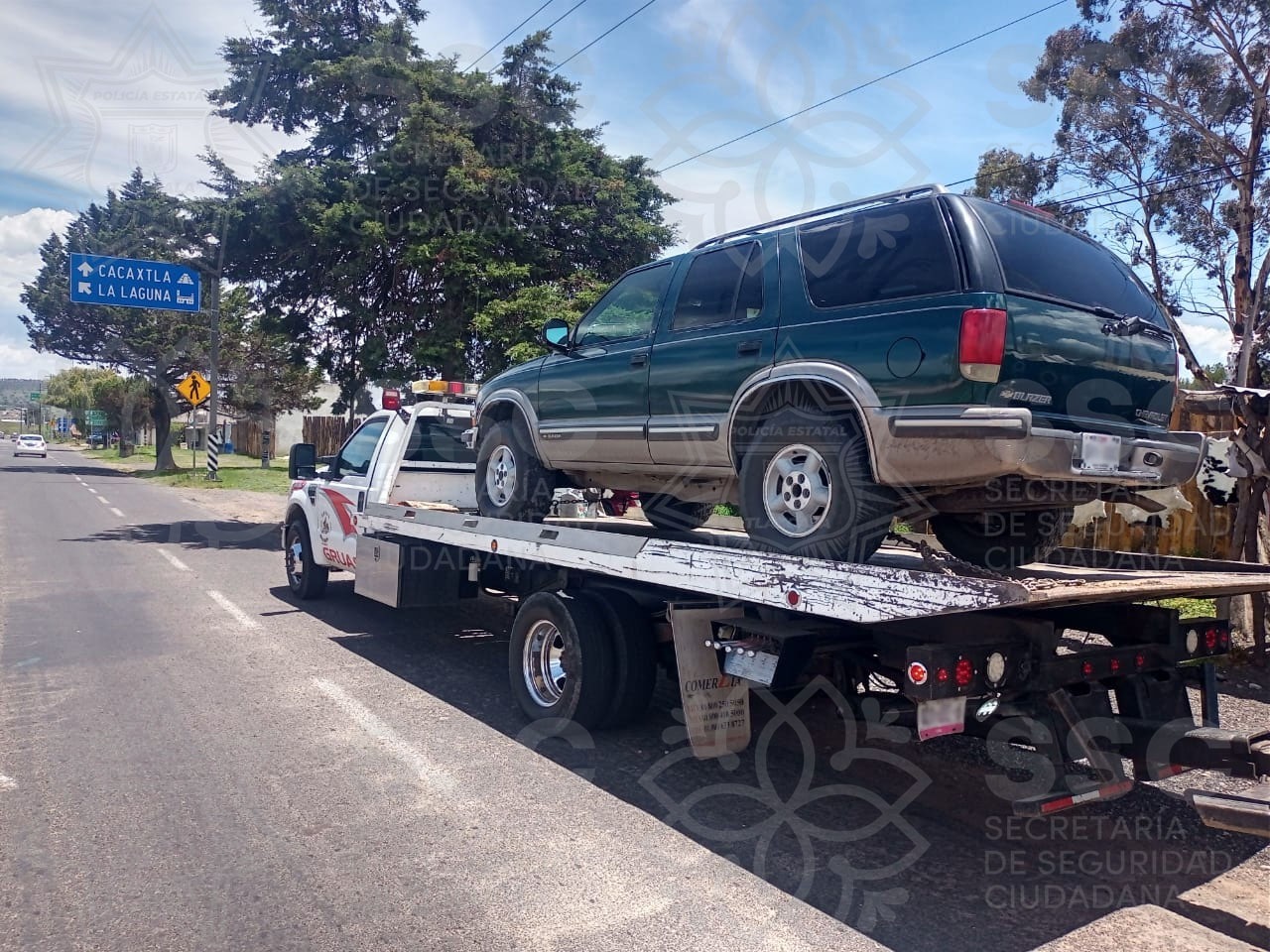 En los municipios de Tlaxco, Zacatelco y Calpulalpan, respectivamente; fue asegurado un vehículo Chevrolet Blazer con placas sobrepuestas, un automóvil Volkswagen, Derby con matrícula vehicular TZL7750 abandonado con huellas de desvalijamiento; además de dos cajas secas con placas 58UL2C y 53UL2C y un Dolly sin placas de circulación; las cuales fueron encontradas abandonadas y obstruyendo las vías de comunicación.