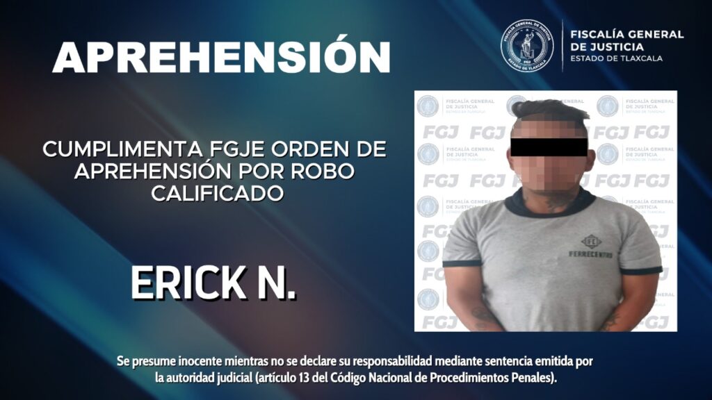 La Fiscalía General de Justicia del Estado (FGJE), a través de la Policía de Investigación, cumplimentó una orden de aprehensión en contra de Erick N., por su probable participación en el delito de robo calificado, en agravio de una empresa comercial.