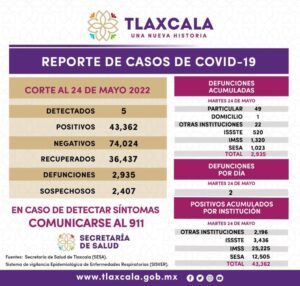 Los datos de la SESA registrados en la plataforma nacional del Sistema de Vigilancia Epidemiológica de Enfermedades Respiratorias (Sisver), confirmaron cinco casos positivos de Covid-19 y dos defunciones, el 24 de mayo de 2022 en la entidad.