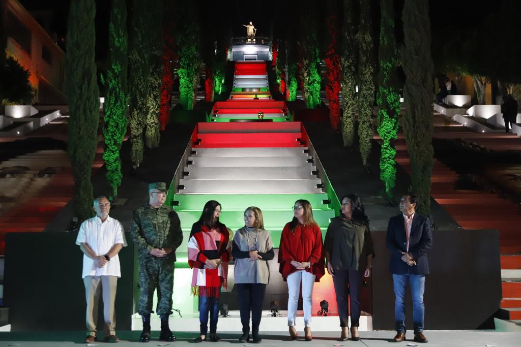 La gobernadora Lorena Cuéllar Cisneros realizó el encendido de la iluminación alusiva al mes patrio en las Escalinatas de los Héroes, espacio que además fue decorado con imágenes de los héroes nacionales que impulsaron la Independencia de México.