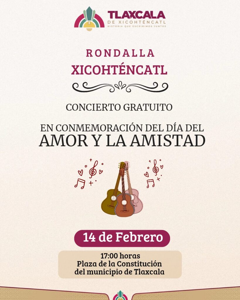 El Gobierno Municipal de Tlaxcala, que preside Alfonso Sánchez García, invita a la ciudadanía en general al concierto gratuito de la Rondalla Xicohténcatl, que se llevará a cabo el próximo sábado 14 de febrero a las 17:00 horas en la Plaza de la Constitución, como parte de las celebraciones por el Día del Amor y la Amistad.