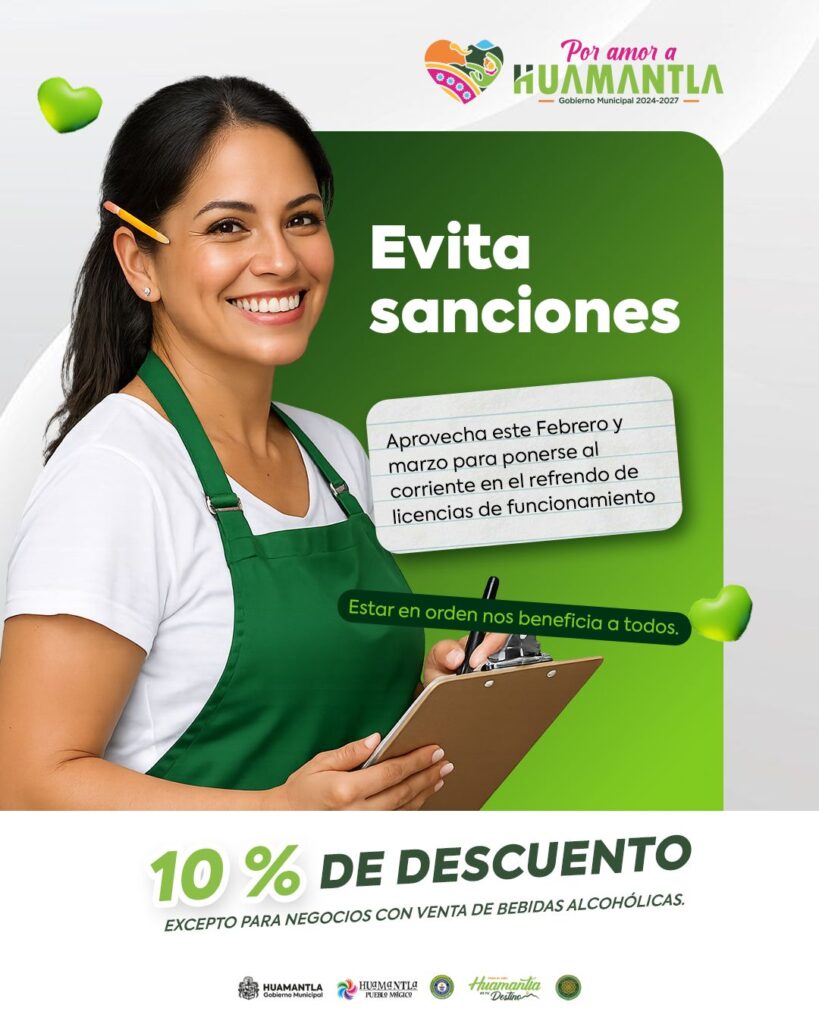 Huamantla, Tlaxcala.– Con el objetivo de fortalecer el orden administrativo y apoyar a los comercios establecidos, el Gobierno Municipal de Huamantla invita a comerciantes y prestadores de servicios a ponerse al corriente en el refrendo de sus Licencias de Funcionamiento durante los meses de febrero y marzo.