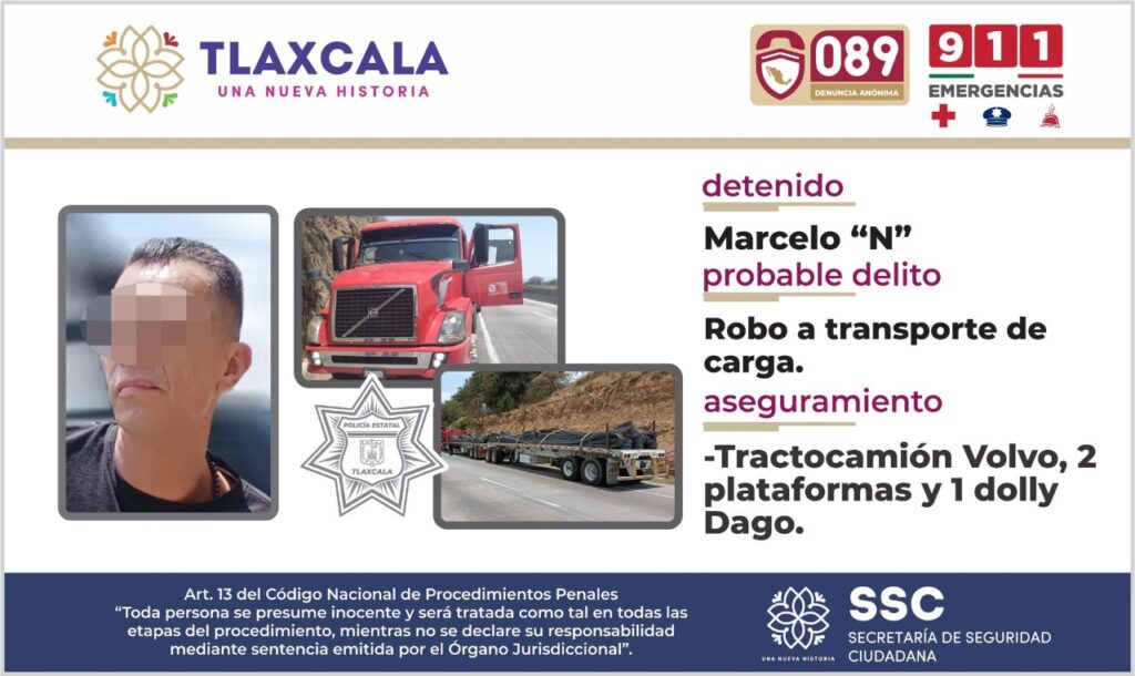 A través de acciones permanentes para la prevención e inhibición del delito, fundamentales para la seguridad pública que atiende y combate el fenómeno social de la delincuencia, la Secretaría de Seguridad Ciudadana (SSC) detuvo a una persona en el municipio de Calpulalpan, mismo que se presume como responsable de robo a transporte de carga.
