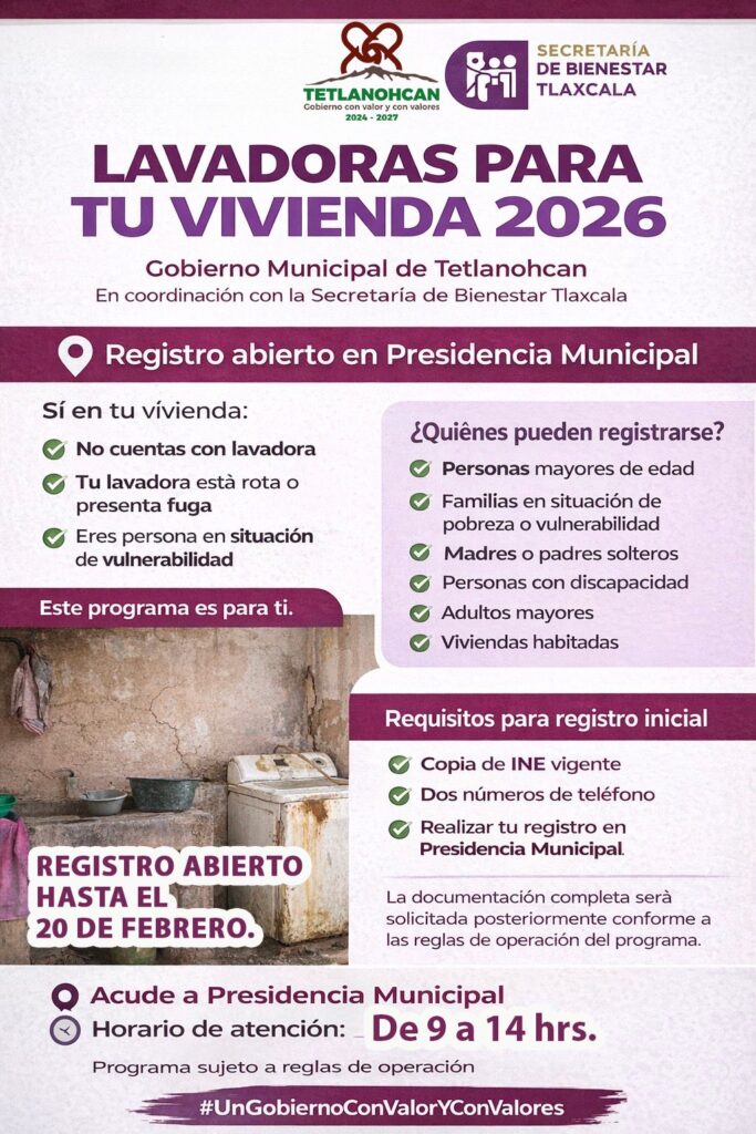 Como parte de las gestiones orientadas al bienestar de las familias, el Gobierno Municipal de Tetlanohcan, que encabeza Kritsbey Pérez Flores, en coordinación con la Secretaría de Bienestar Tlaxcala, mantiene abierto el registro para el programa Lavadoras para tu Vivienda 2026.