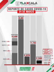 De acuerdo con el reporte del 24 de marzo, la Secretaría de Salud del Estado confirmó 19 personas recuperadas, 4 fallecimientos y 25 casos positivos de Covid-19 de tlaxcaltecas identificados en el estado y 10 en otras entidades.
