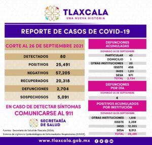Los datos de la SESA registrados en la plataforma nacional del Sistema de Vigilancia Epidemiológica de Enfermedades Respiratorias (SISVER), confirmaron 80 casos positivos de Covid-19 y cuatro defunciones el domingo 26 de septiembre de 2021.