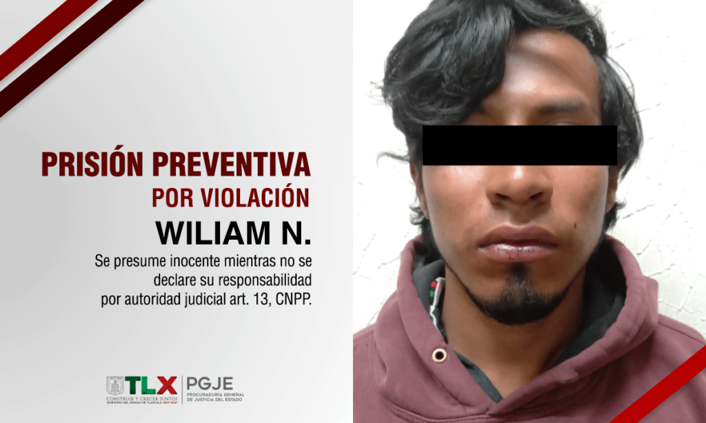 Durante la exposición de datos de prueba por parte del Agente del Ministerio Público adscrito a la Procuraduría General de Justicia del Estado (PGJE), se logró que un Juez de Control dictara prisión preventiva oficiosa como medida cautelar en contra de Wiliam N., por el delito de violación en agravio de una menor de edad.