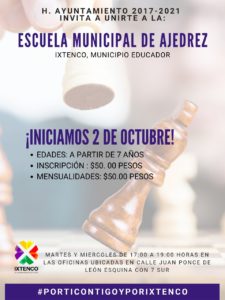 Con el objetivo de que infantes y adolescentes desarrollen mayores habilidades y tengan un mejor desempeño escolar, el Gobierno Municipal de Ixtenco que encabeza Miguel Ángel Caballero Yonca creo la primera escuela Municipal de Ajedrez, que además es la primera de este tipo que existe en el Estado de Tlaxcala.