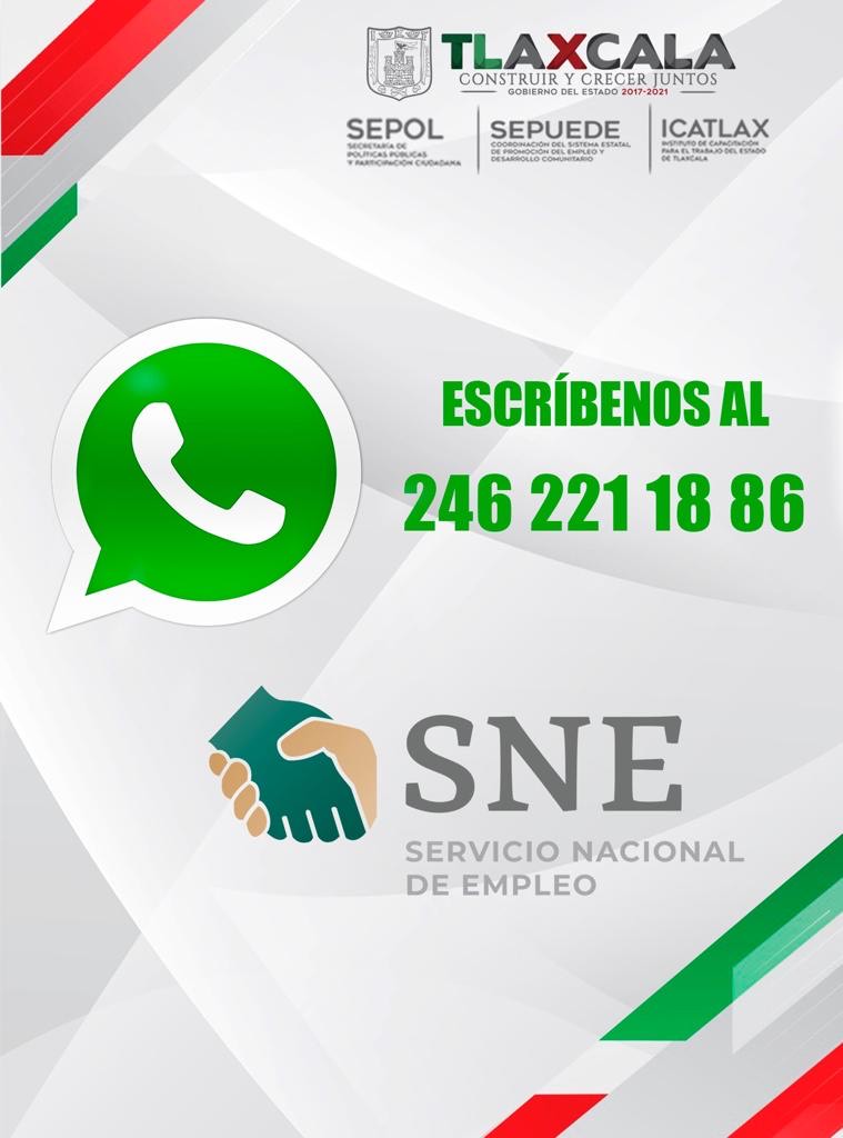 El titular de la Secretaría de Políticas Públicas y del Sistema Estatal de Promoción del Empleo (Sepol-Sepuede), Manuel Camacho Higareda, informó que, a partir de este mes, el Servicio Nacional del Empleo en Tlaxcala (SNE) ofrece a los ciudadanos orientaciones personalizadas mediante el número de WhatsApp 246 221 18 86, con el objetivo de garantizar información de los servicios que ofrece la dependencia en materia de empleabilidad y vinculación laboral.