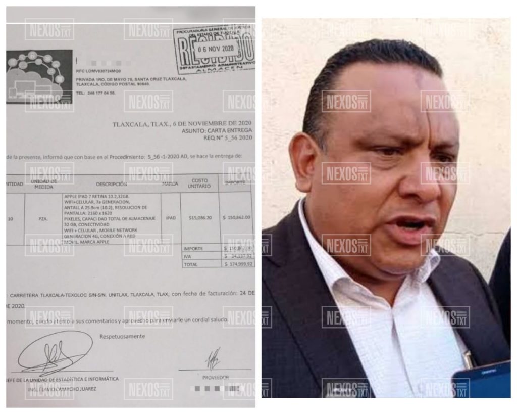 De acuerdo con la denuncia que hicieron llegar a esta redacción, el ‘abogado’ de Tlaxcala, adquirió 10 dispositivos electrónicos denominados “Apple Ipad 7 Retina 10” de 32 Gigabytes, con un monto de 174 mil 999.92 pesos.