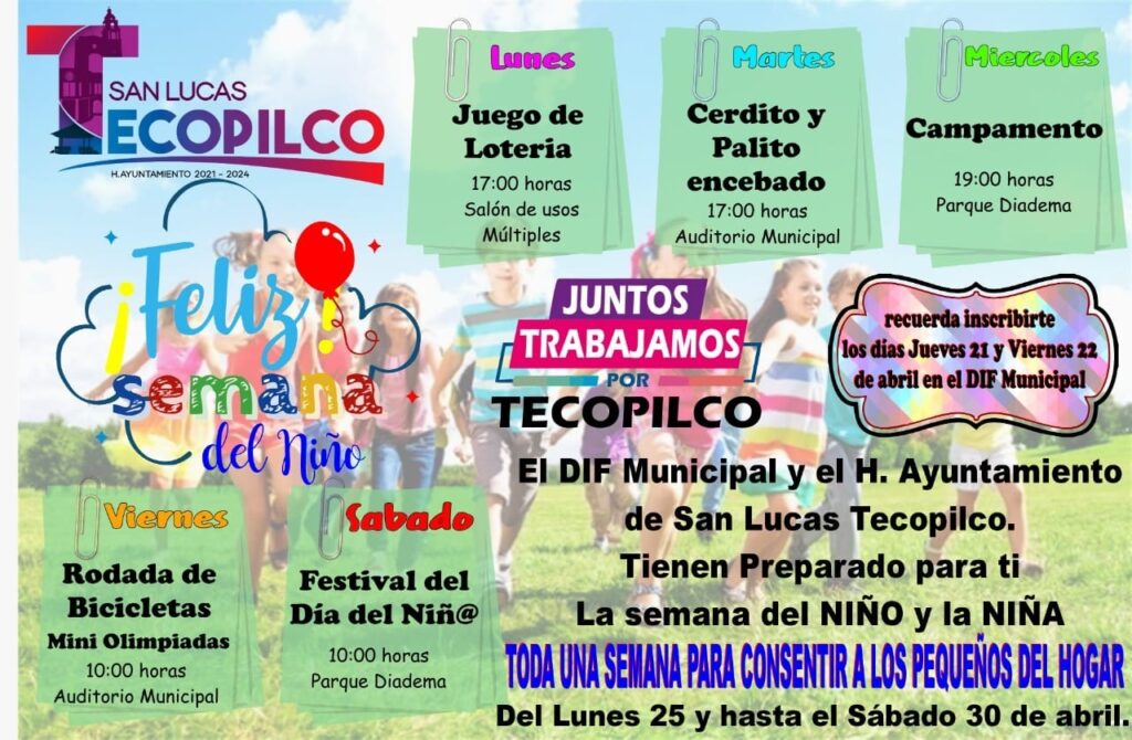 El presidente municipal de San Lucas Tecopilco, Abiran Misael Báez Pérez, anunció la “Feliz Semana del Niño y la Niña”, que su Ayuntamiento realizará a partir del lunes 25 y hasta el sábado 30 de abril, con una gran clausura.