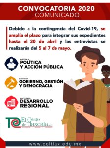 Debido a la contingencia sanitaria por la cual atraviesa el país a causa del Covid-19, El Colegio de Tlaxcala, A.C. (Coltlax), amplió el período de registro y entrega de expediente de las convocatorias 2020 de las maestrías en Desarrollo Regional (MDR), Gobierno, Gestión y Democracia (MGGD) y Política y Acción Pública (MPAP), hasta el jueves 30 de abril.