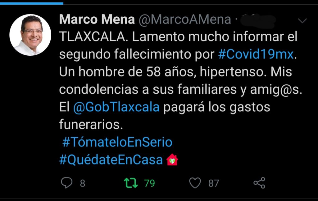 La mañana de este domingo, el Gobernador del Estado, Marco Mena, informó el segundo deceso por el Sars-CoV-2 (Cvodi-19), en Tlaxcala, cuya víctima, fue un hombre de 58 años de edad, hipertenso.