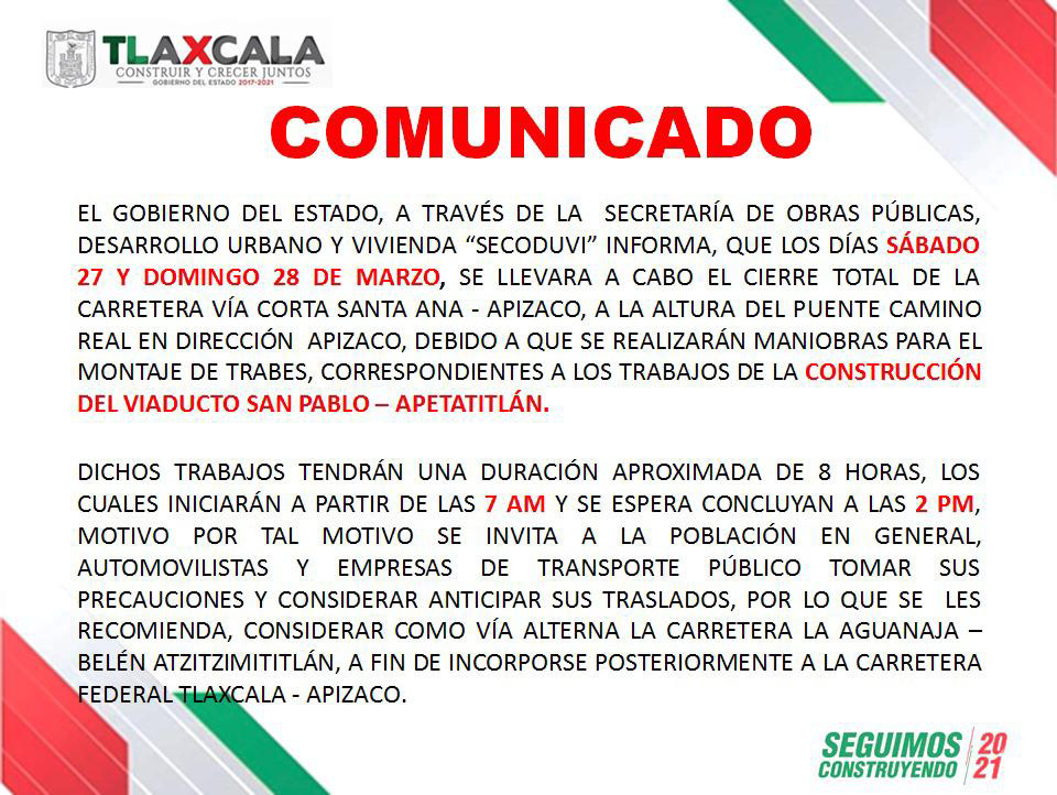 La Secretaría de Obras Públicas, Desarrollo Urbano y Vivienda (Secoduvi) dio a conocer que el sábado 27 y domingo 28 de marzo, se llevará a cabo el cierre total de la carretera vía corta Santa Ana-Apizaco, a la altura del puente Camino Real en dirección a Apizaco, debido a que se realizará el montaje de trabes como parte de la construcción del Viaducto San Pablo-Apetatitlán.