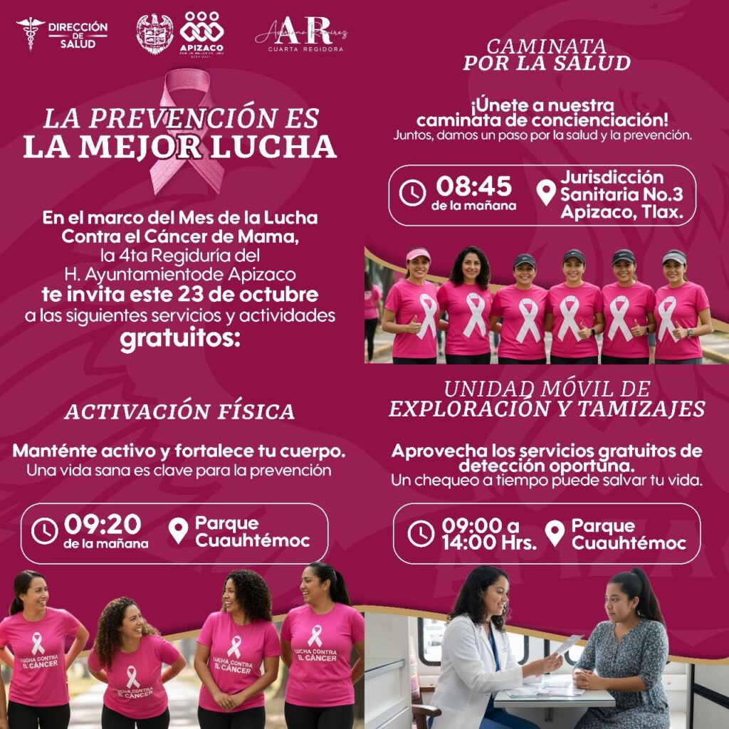 • El Ayuntamiento de Apizaco y la Cuarta Regiduría organizan actividades gratuitas este 23 de octubre para fomentar la detección oportuna y el autocuidado.