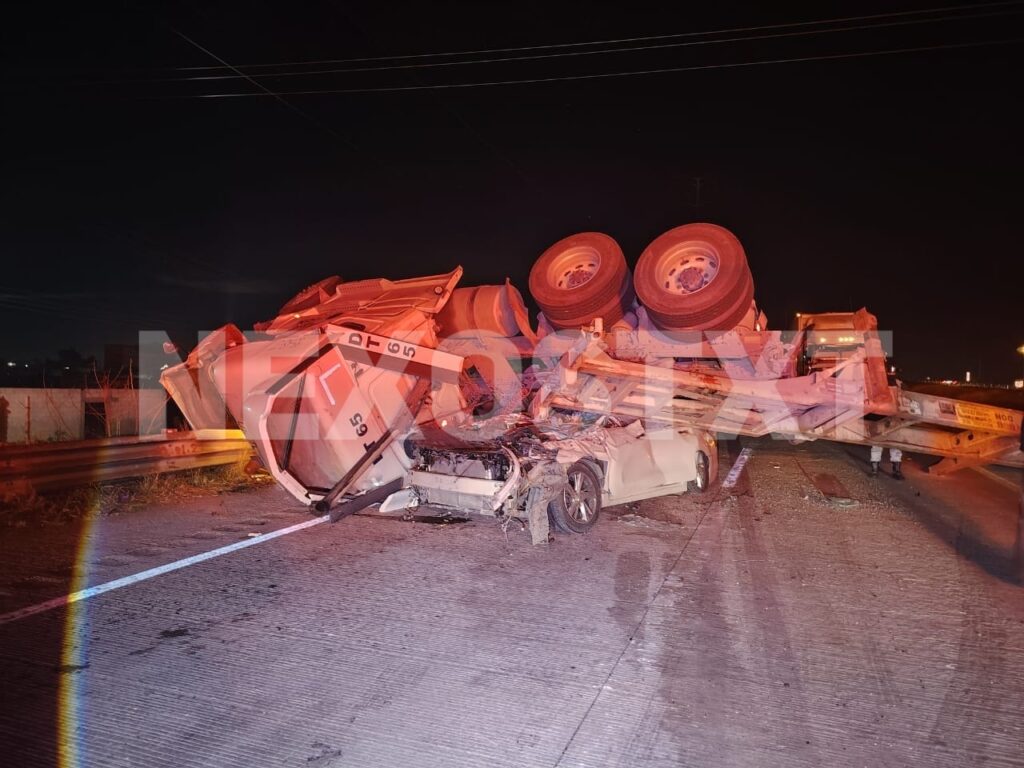 Un grave siniestro vial se registró esta madrugada en el kilómetro 225 de la autopista Arco Norte, a la altura de Sanctórum, en el estado de Tlaxcala. El incidente involucró a un tractocamión que volcó, generando un impacto directo contra un vehículo particular tipo Sentra.