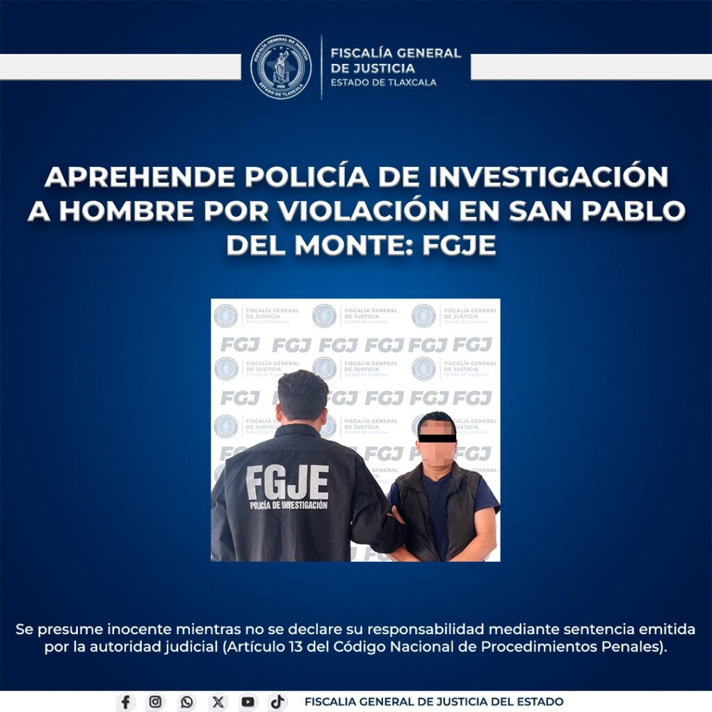 Agentes de la Policía de Investigación de la Fiscalía General de Justicia del Estado (FGJE) aprehendieron a Gilberto N. por el delito de violación, cometido en San Pablo del Monte.