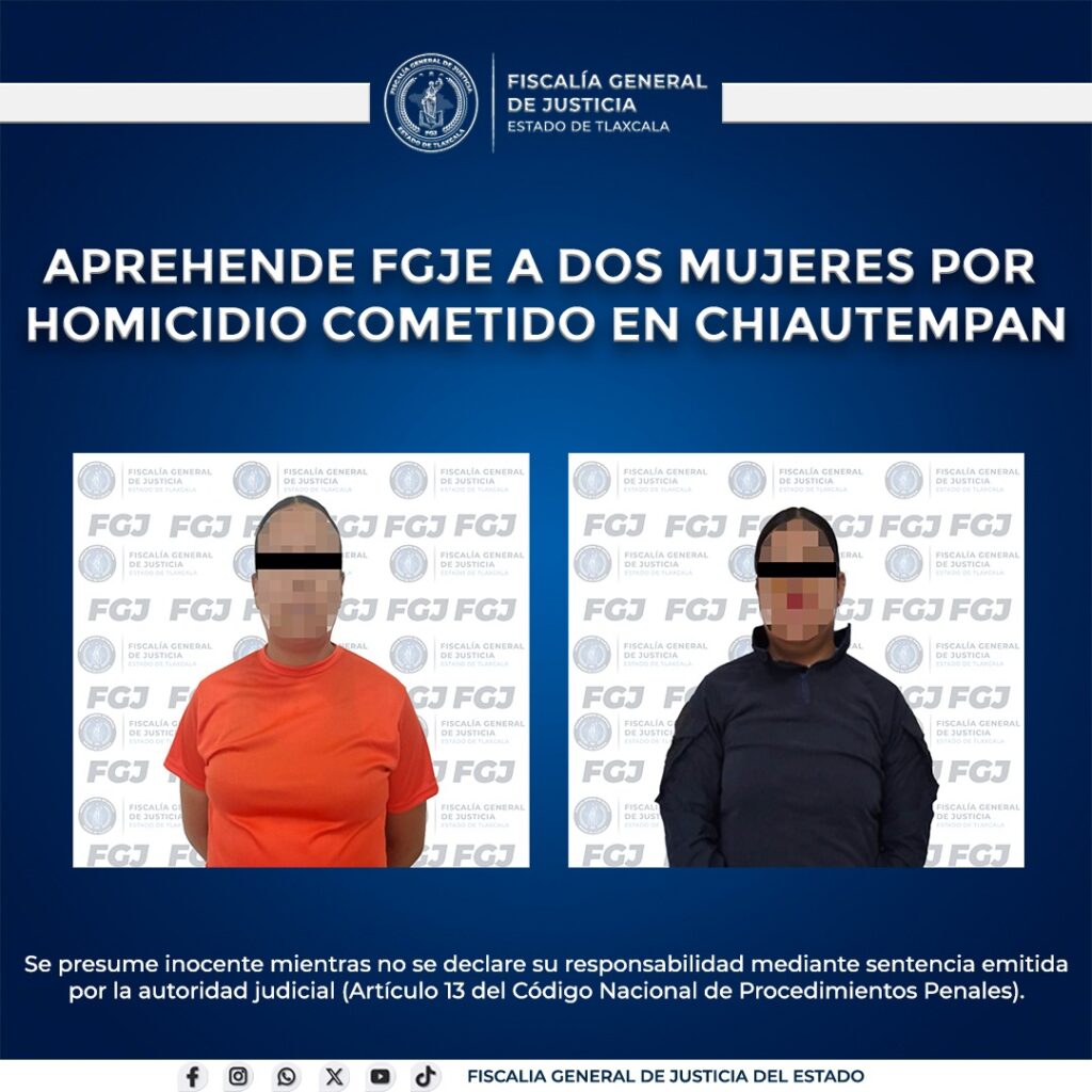 Las investigaciones de inteligencia realizadas por la Policía de Investigación de la Fiscalía General de Justicia del Estado (FGJE) permitieron la detención de Lizbeth N. y Lesly N., por el delito de homicidio calificado, ocurrido en el municipio de Chiautempan.