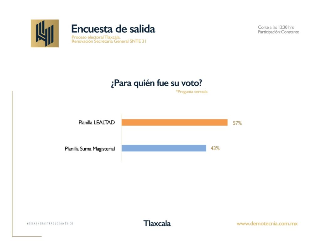 Profesor de telesecundarias y proveniente de la base trabajadora, Arturo Morales de la Planilla LEALTAD según la primera encuesta de salida, presenta una clara ventaja de 14 puntos sobre Cutberto Chávez de Suma Magisterial, esta información al corte de las 12:30 hrs a treinta minutos del cierre de las Asambleas Electivas.