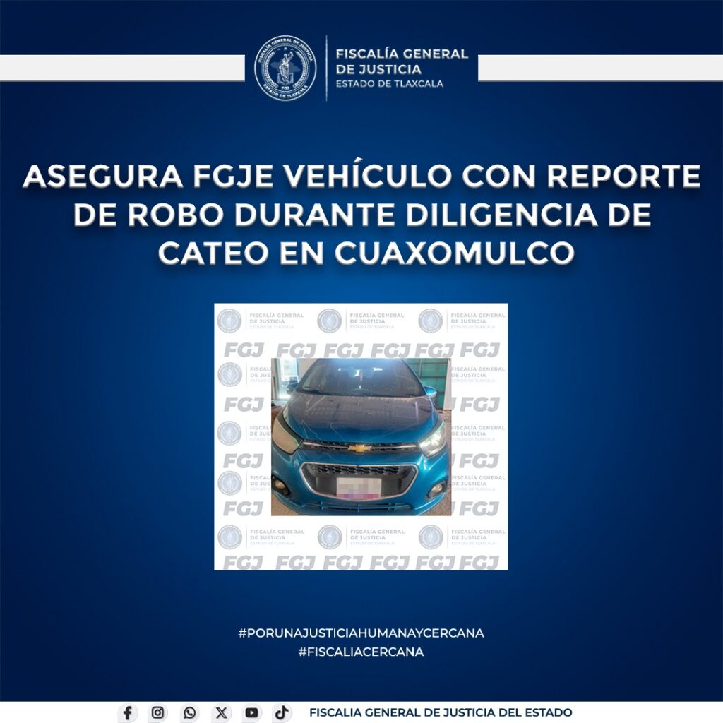 La Fiscalía General de Justicia del Estado reafirma su compromiso con la legalidad y la protección del patrimonio de la ciudadanía tlaxcalteca, mediante acciones de investigación sólidas y coordinadas que permiten avanzar en el combate al robo de vehículos.