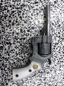 Al realizarle una revisión ocular de rutina, se pudo verificar que entre su ropa ocultaba un arma de fuego tipo revolver de metal, con cachas de color blanco y la leyenda “LLAMA” en letras color dorado.