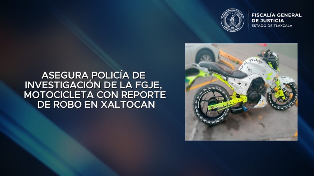 La oportuna intervención de elementos de la Policía de Investigación de la Fiscalía General de Justicia del Estado (FGJE), permitió el aseguramiento de una motocicleta con reporte de robo vigente y alteraciones visibles en sus números de identificación, durante actos de investigación realizados en el municipio de Xaltocan.