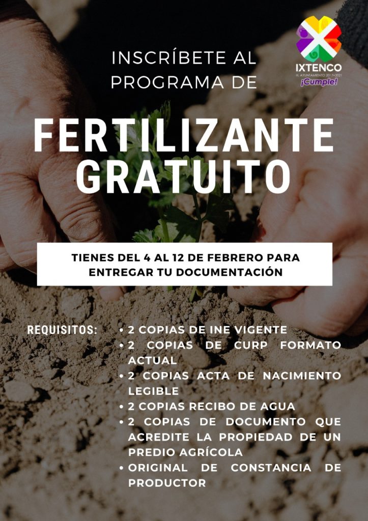 El Gobierno Municipal de Ixtenco, que encabeza Miguel Ángel Caballero Yonca, anunció que aún quedan fichas para acceder al programa de fertilizante agrícola gratuito, los interesados tienen hasta el 12 de febrero para entregar la documentación.
