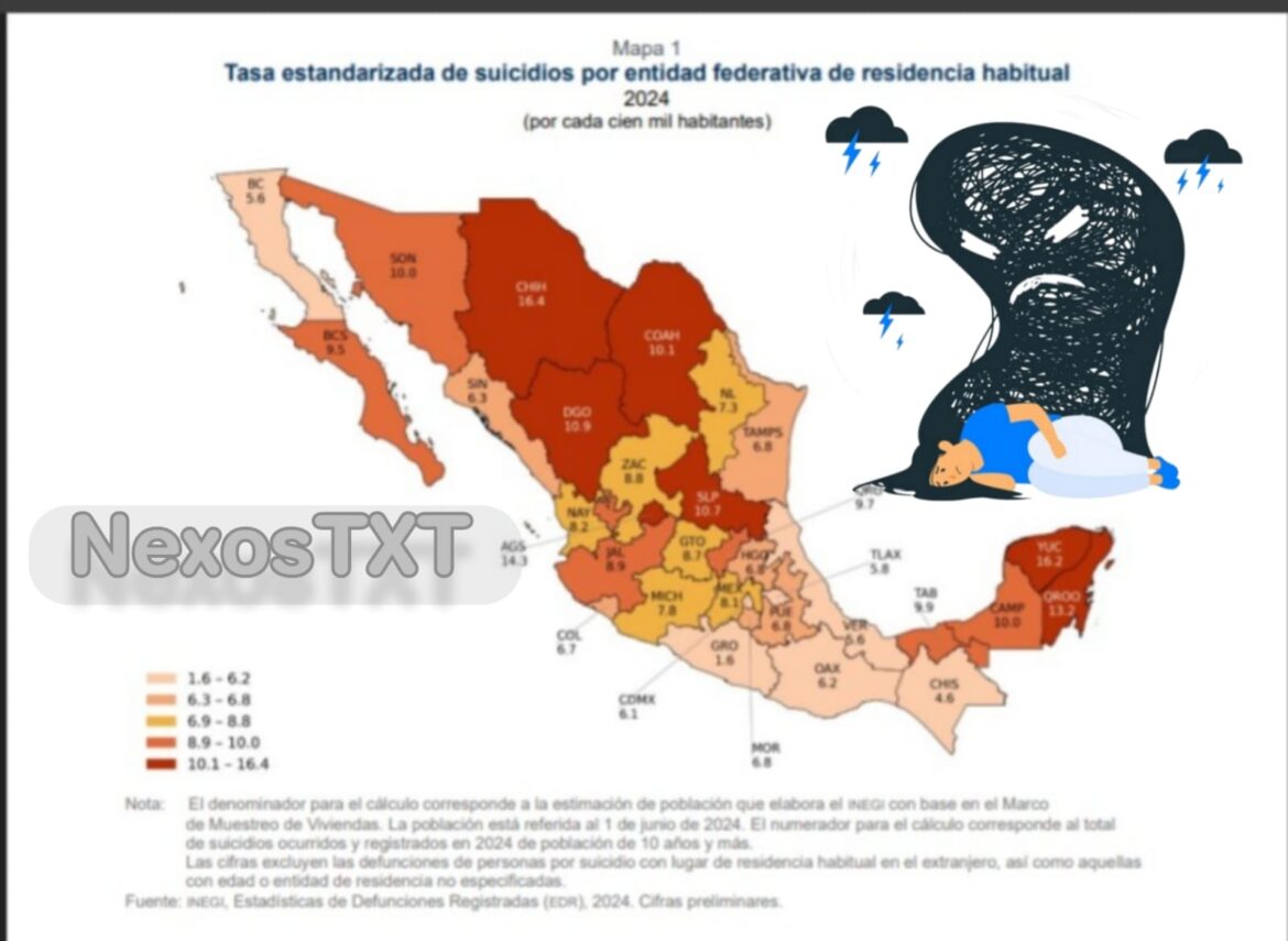 – Durante el 2024, el INEGI reportó que se registraron un total de ocho mil 856 suicidios en el país, lo que equivale a una tasa de 6.8 por cada 100 mil habitantes.