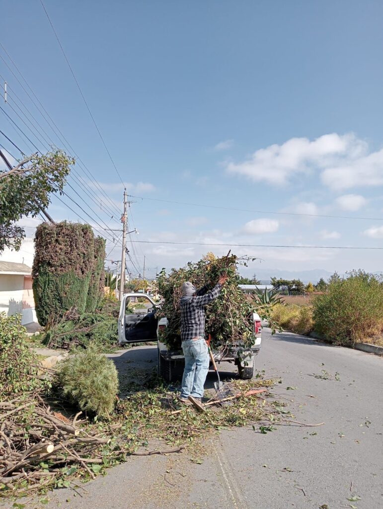 Este día, se llevaron a cabo acciones de poda y descoronamiento de árboles en el fraccionamiento Ignacio Zaragoza, con el objetivo de prevenir riesgos y mantener en buen estado las áreas verdes. Asimismo, se realizaron trabajos de limpieza en panteones del municipio, así como en el bulevar Cuamanco, contribuyendo a conservar espacios ordenados y seguros para la población.