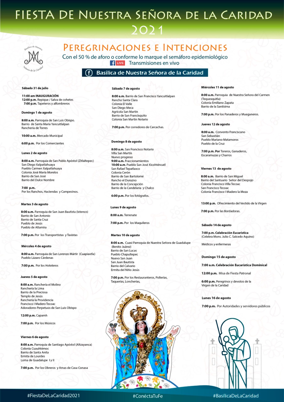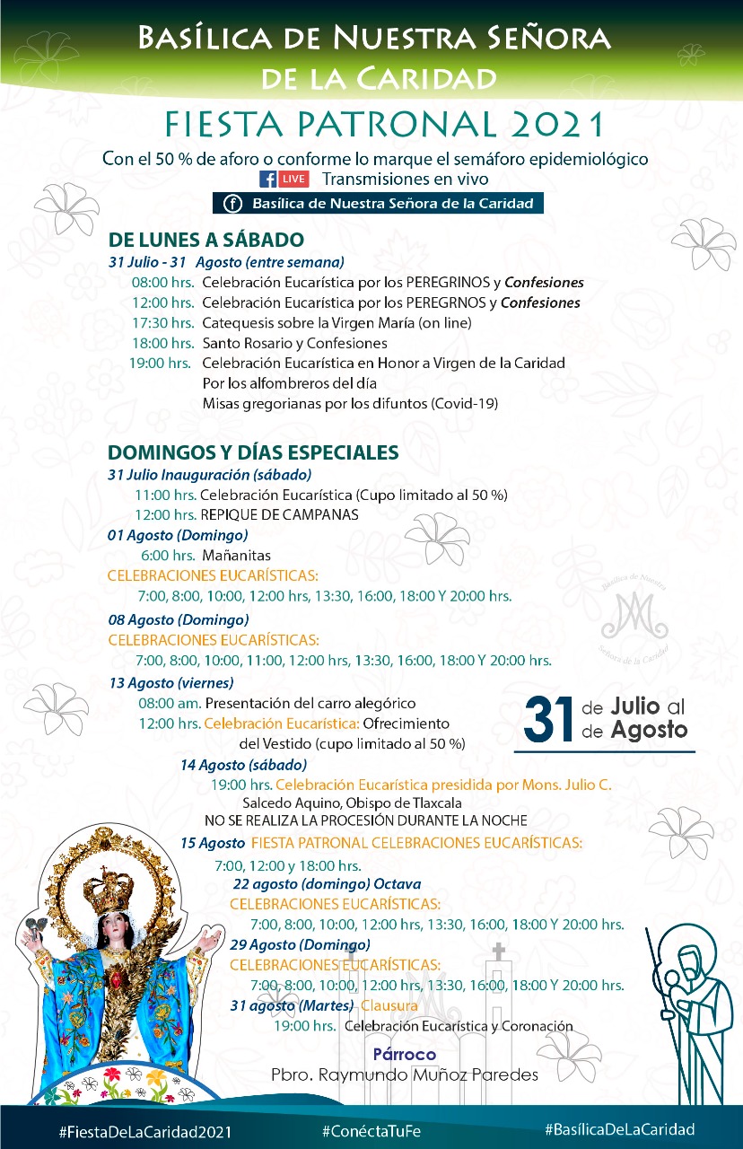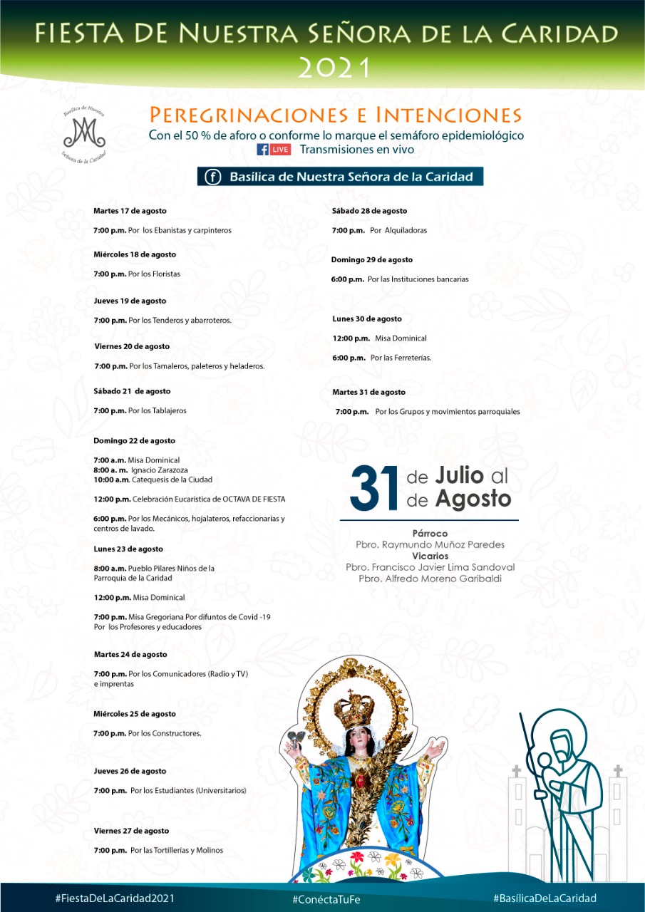 Importante mencionar que la Basílica permanecerá cerrada los días 14 y 15 de agosto y en todo momento las actividades que se realicen serán favoreciendo siempre las medidas de higiene y distanciamiento social marcadas por las autoridades de los tres niveles de gobierno.