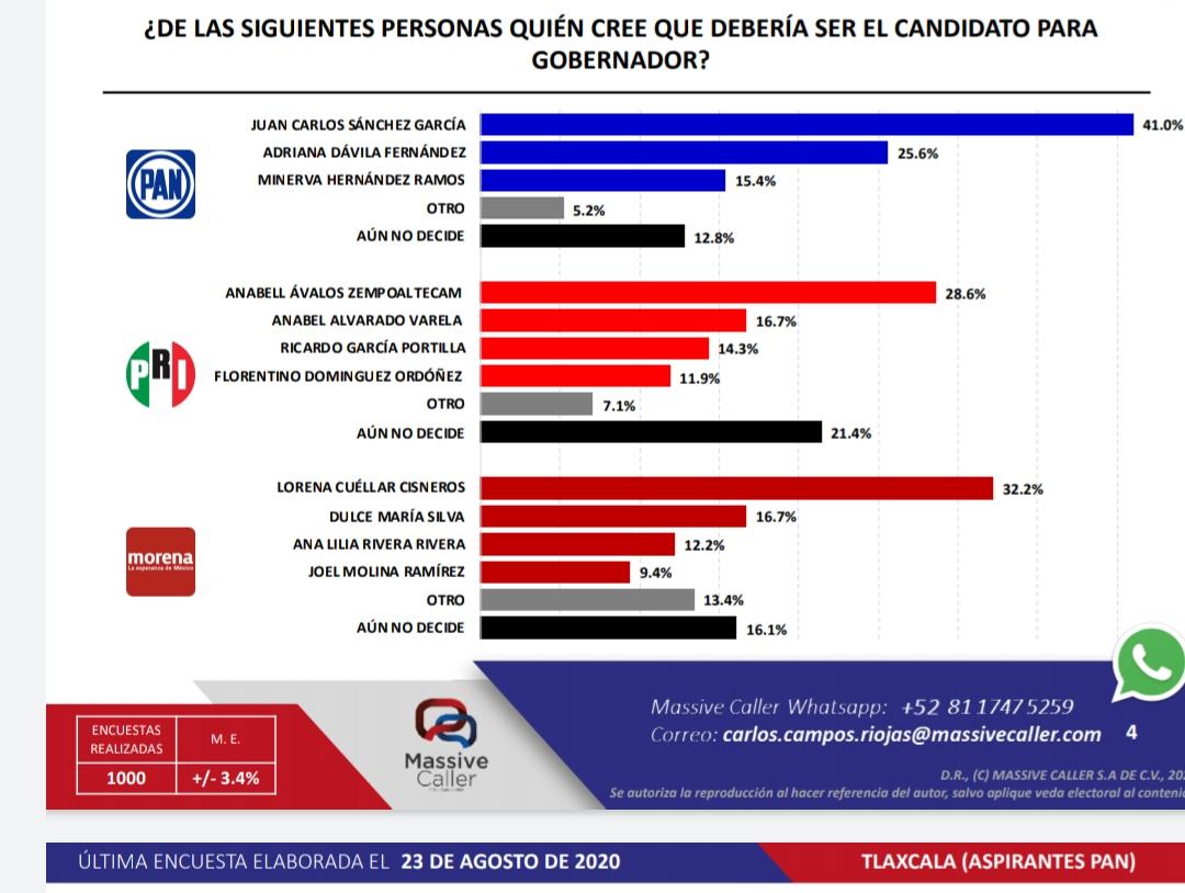 Pero en el tercer ejercicio demoscópico, la huamantleca, Dulce María Silva, sería la favorita para ganar la gubernatura con el 29.9%, dejando en segundo lugar a Anabell Ávalos Zempoalteca, y en tercer lugar con 11.7% a la dos veces derrotada Adriana Dávila Fernández.