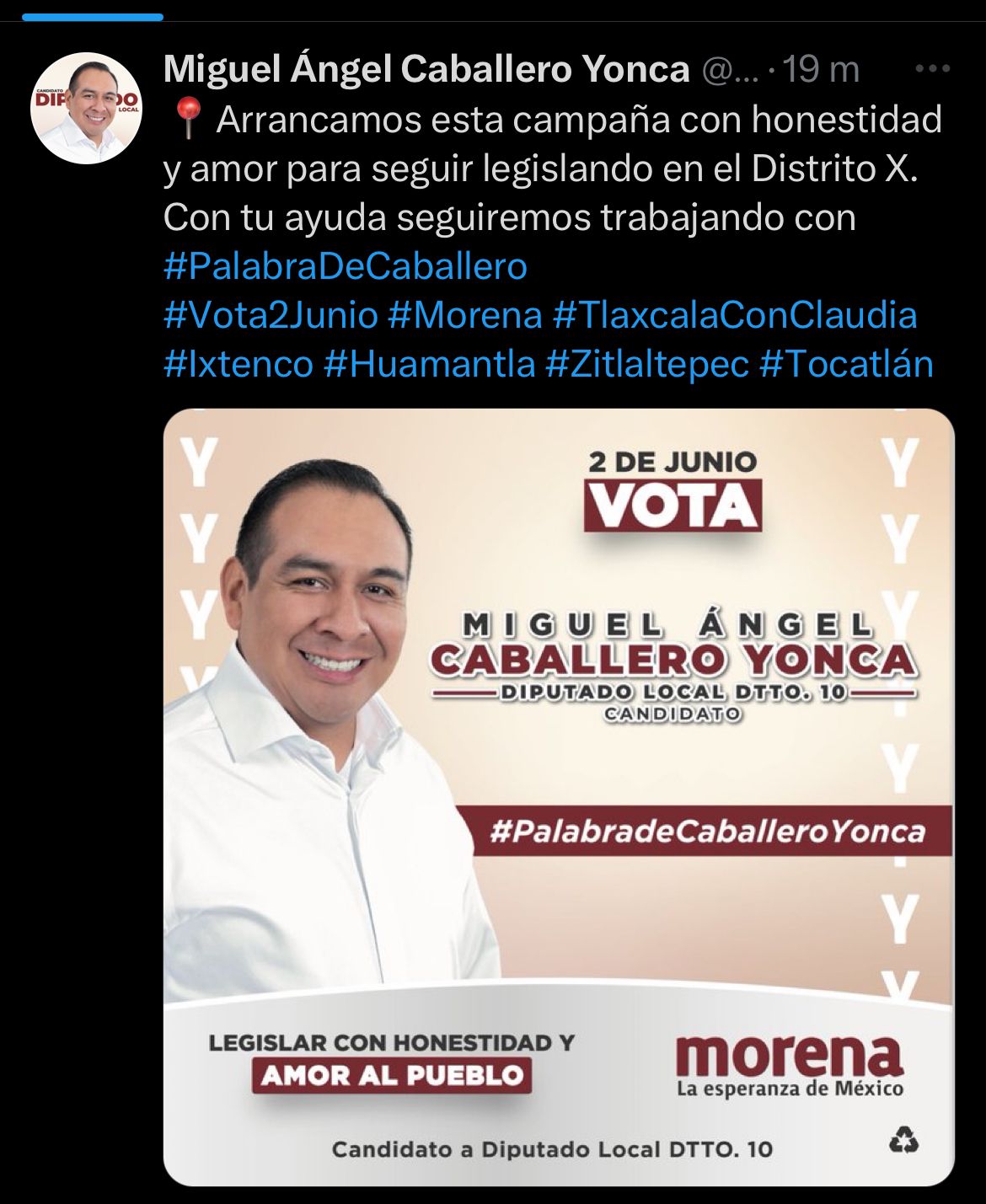 La madrugada de este día, el candidato a la diputación local por el distrito X, que comprende Zitlaltepec, Ixtenco, Huamantla y Tocatlán, Miguel Ángel Caballero Yonca, inició sus actividades proselitistas en redes sociales rumbo al 2 de junio.