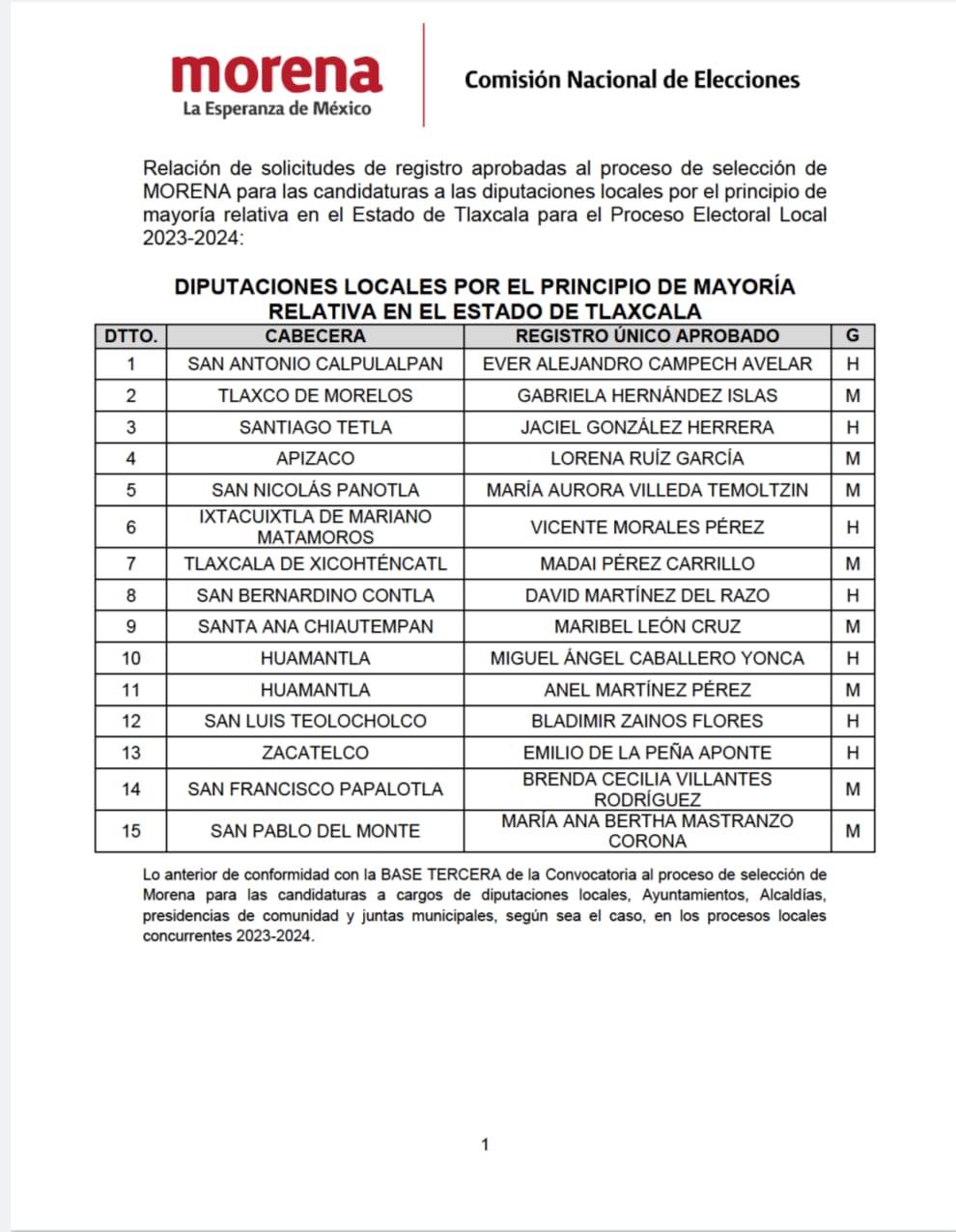 La Comisión Nacional de Elecciones del Comité Ejecutivo Nacional de Morena dio a conocer su lista de candidatos para presidencias municipales en Tlaxcala para el próximo proceso electoral local.