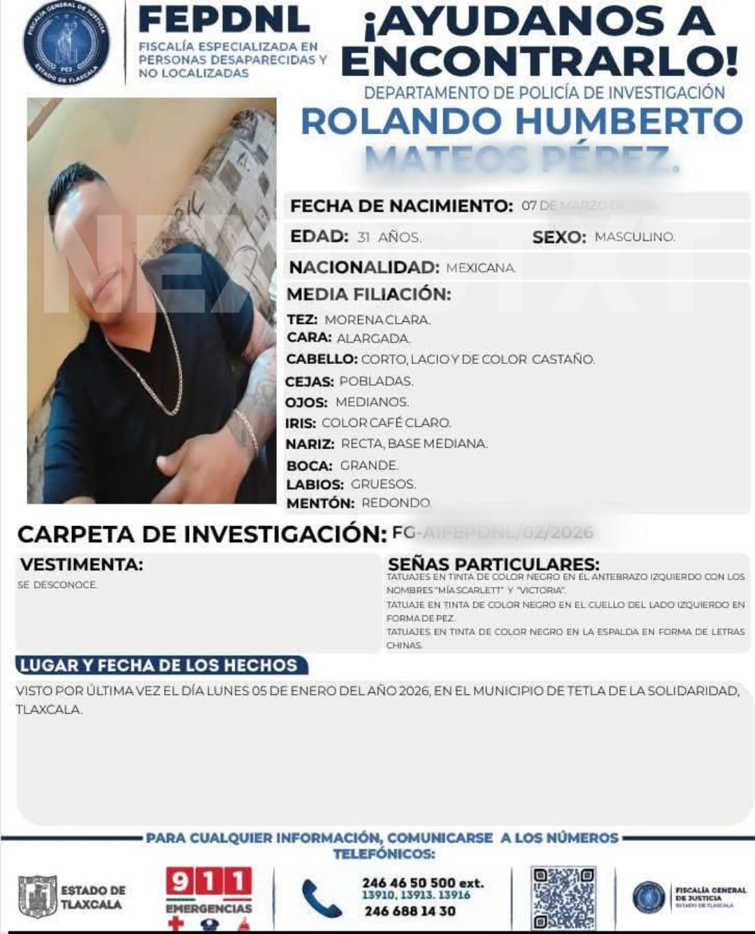 Familiares denunciaron los hechos ante la Fiscalía Especializada en Personas Desaparecidas y No Localizadas (FEPDNL), que emitió fichas de búsqueda. “El Pescado”, cuyo nombre completo es Rolando Humberto Mateos Pérez, dirige un grupo dedicado a extorsión, robo a cuentahabientes, cobro de piso, venta de drogas, préstamos gota a gota y asaltos armados.