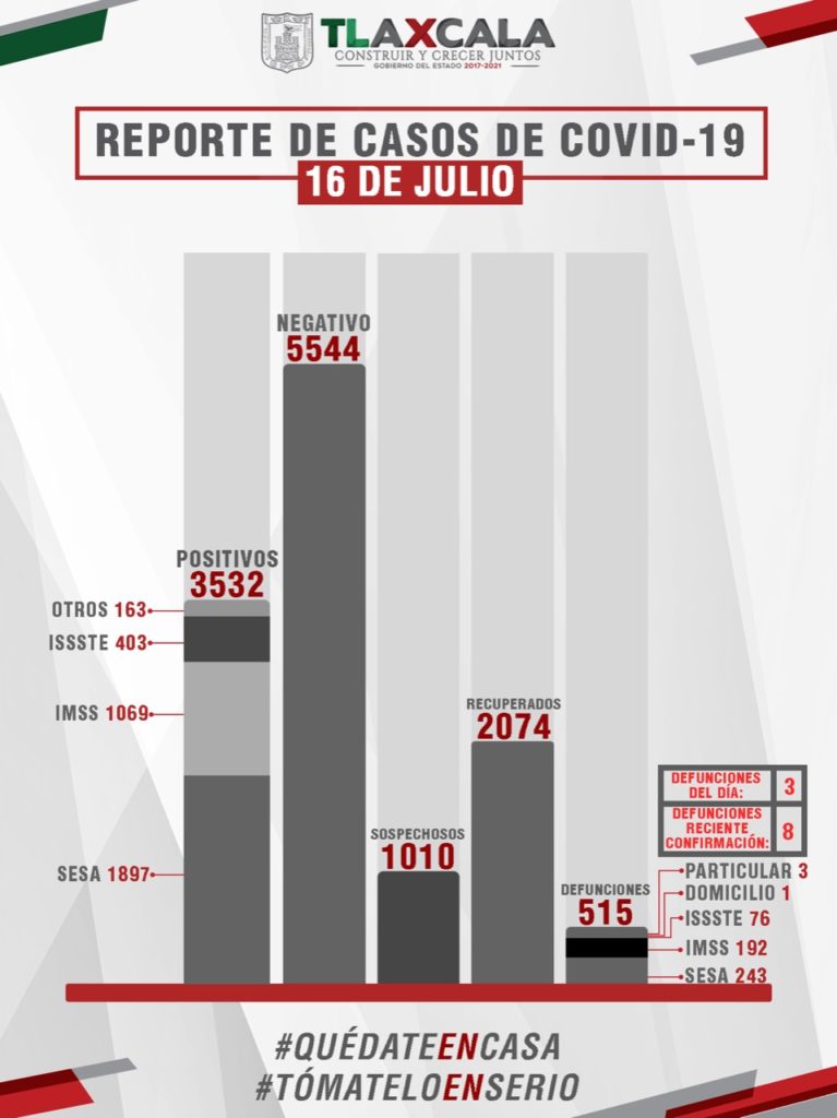 De esta manera, el estado registra dos mil 74 personas recuperadas, tres mil 532 casos positivos y 515 fallecimientos.