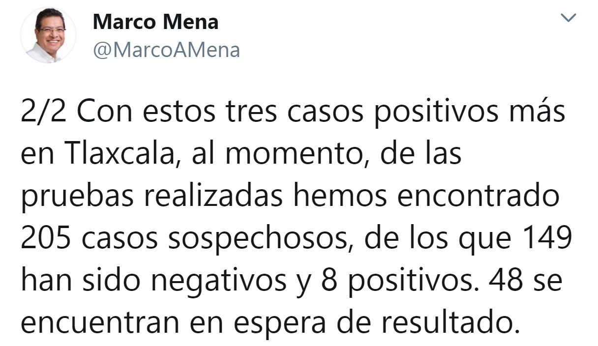 En un segundo mensaje escribió: “Con estos tres casos positivos más en Tlaxcala, al momento, de las pruebas realizadas hemos encontrado 205 casos sospechosos, de los que 149 han sido negativos y 8 positivos. 48 se encuentran en espera de resultado”.