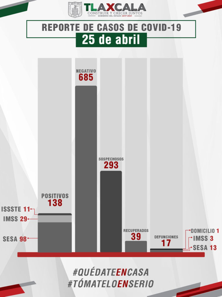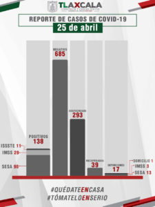 El estado registra, hasta este momento, 685 casos negativos, 293 se encuentran en espera de resultado y 138 bajo vigilancia epidemiológica.