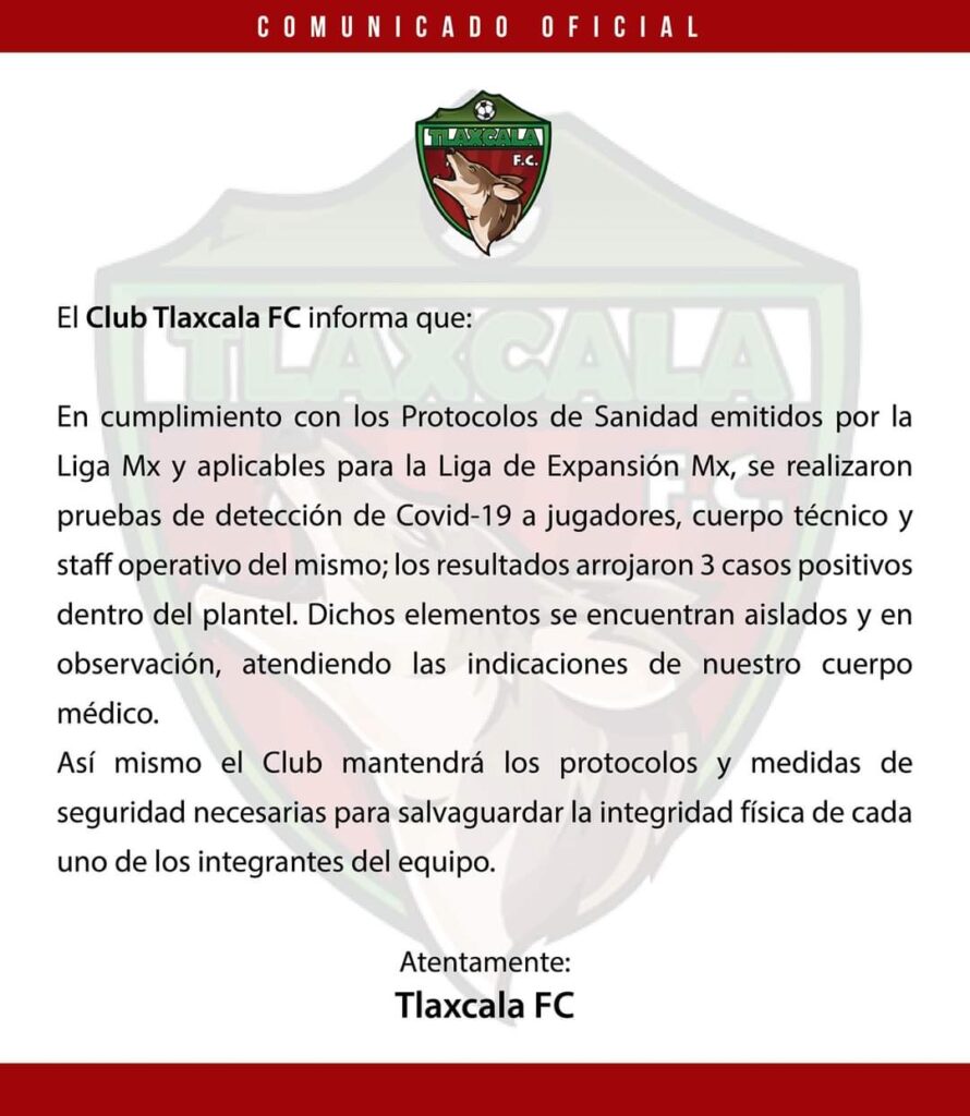 A través de un comunicado, el Club Tlaxcala FC informó a sus fanáticos que tres personas que forman parte del cuerpo auxiliar y técnico del equipo de fútbol dieron positivo a Covid-19.