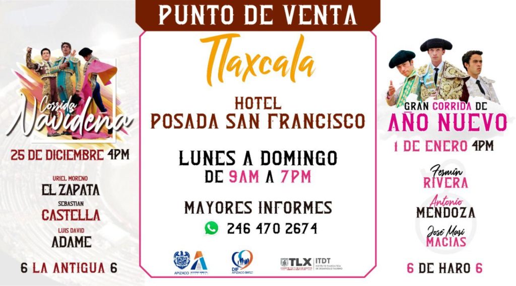 En vísperas de la Tradicional Corrida Navideña y de Año Nuevo, el Gobierno de Apizaco dio a conocer que en el Hotel Posada San Francisco en Tlaxcala, Centro y en la Presidencia Municipal de Apizaco pueden adquirir sus boletos de acceso.