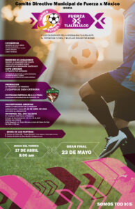 El Comité Directivo Municipal (CDM) del Partido “Fuerza por México”, abrió la convocatoria al Torneo de Futbol 7 “Fuerza por Tlaltelulco”, que se llevará a cabo en ese municipio del 17 de abril al 23 de mayo y contempla tres categorías: infantil, libre varonil y libre femenil, informó Patricia Martínez Cortés, presidenta de comité y organizadora del torneo.