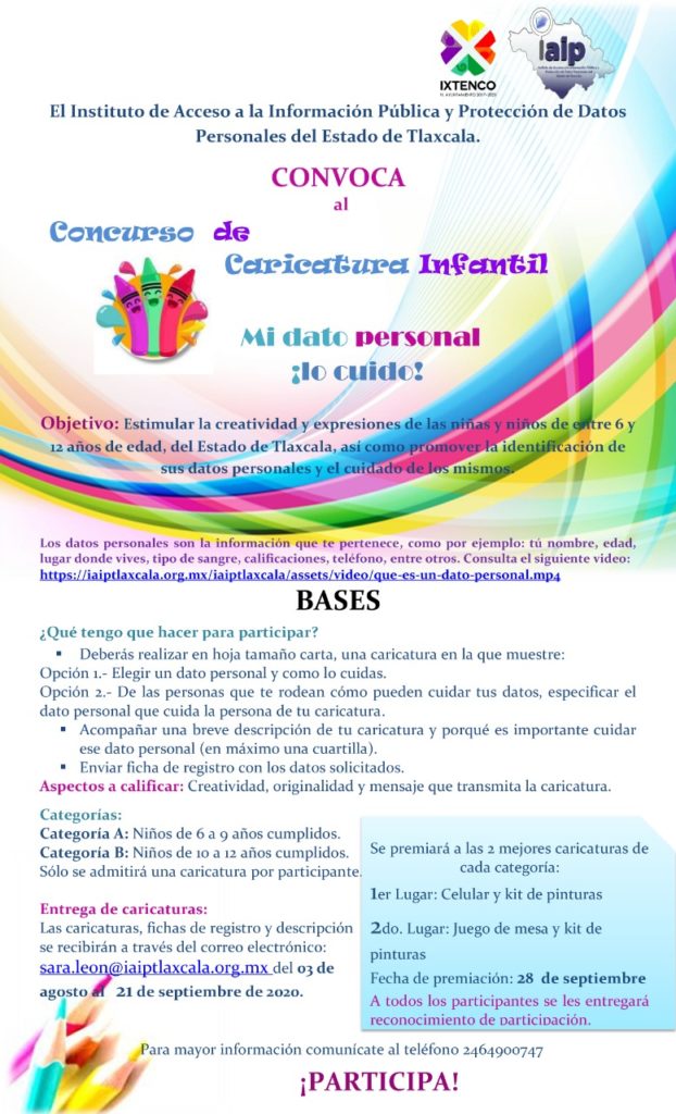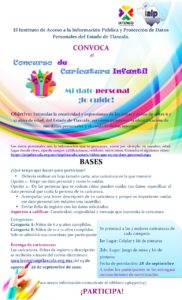 Con el objetivo de estimular la creatividad y expresiones de las niñas y niños de entre 6 y 12 años de edad del Estado de Tlaxcala, así como promover la identificación de sus datos personales y el cuidado de los mismos, el Instituto de Acceso a la Información Pública y Protección de Datos Personales del Estado de Tlaxcala, convocan a los niños de la demarcación otomí, al primer concurso de caricatura infantil “Mi dato personal ¡lo cuido!”