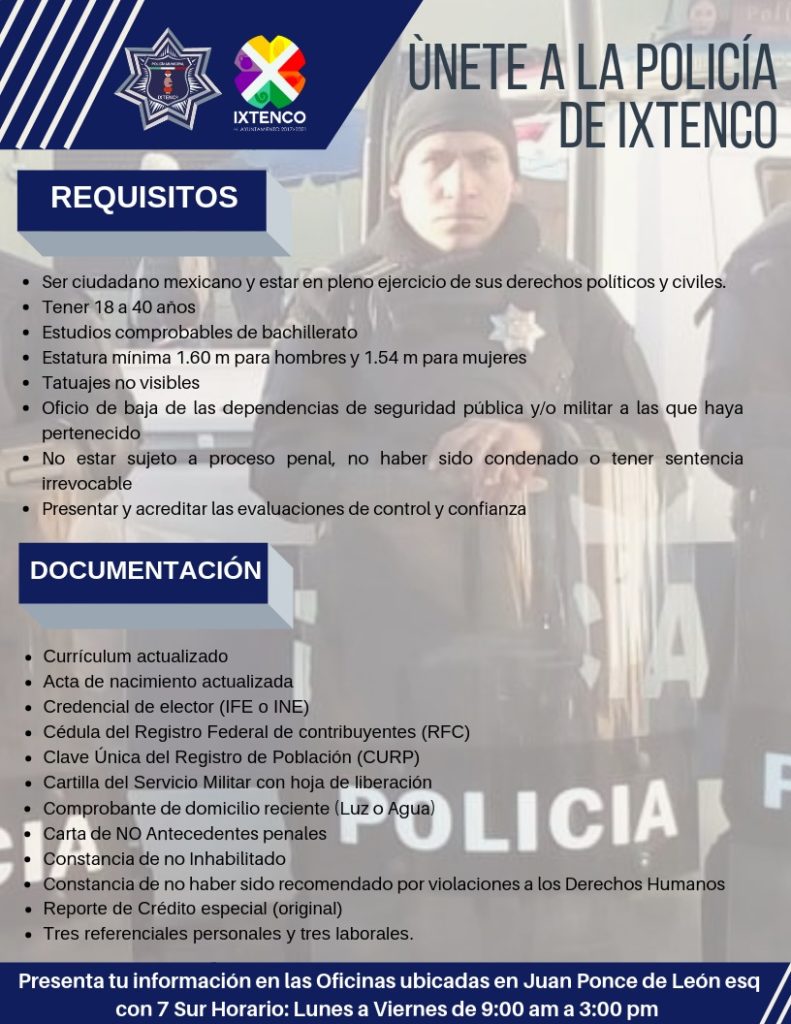 El Gobierno Municipal que encabeza Miguel Ángel Caballero Yonca, a través de la Comisaría Municipal de Ixtenco, reabrió la convocatoria para pertenecer a la fuerza policial de esta demarcación.