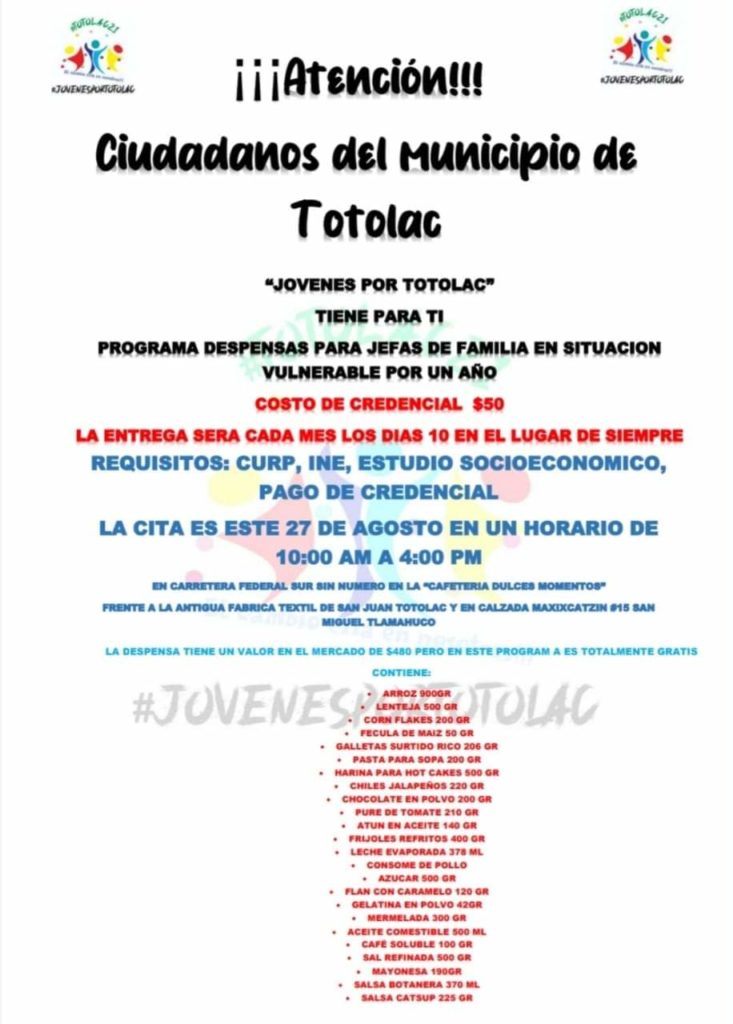 La Organización en formación denominada “Jóvenes por Totolac”, invitan a madres de familia en situación de vulnerabilidad, a acudir a la comunidad de San Miguel Tlamahuco, para inscribirse a un programa de ayuda que consiste en obtener una despensa gratuita, durante un año.