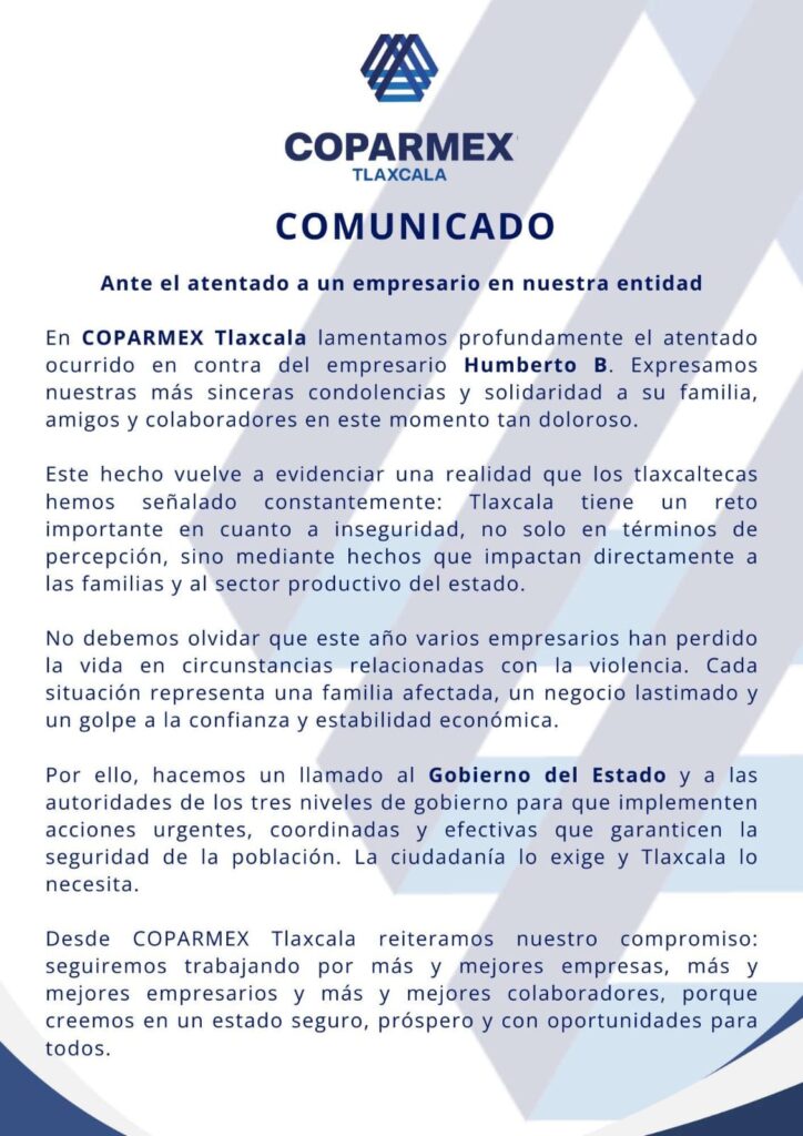 La Confederación Patronal de la República Mexicana (COPARMEX) en Tlaxcala condenó el atentado que sufrió el empresario Humberto B., un hecho que, además de causar indignación, volvió a exponer la vulnerabilidad en la que opera el sector productivo en la entidad.